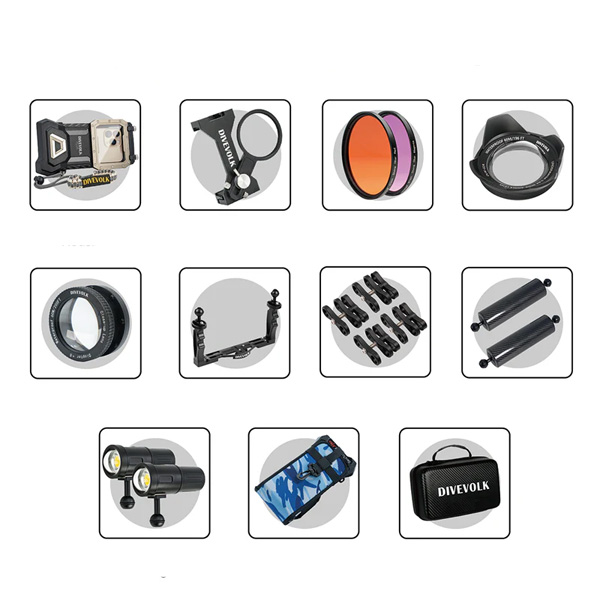 • 1 x Objectif grand angle : pour élargir l’angle de vu sous l’eau et corriger la distorsion des bords